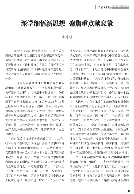 Ò»¡¢¡¶Ï°½üÆ½Öø×÷Ñ¡¶Á¡·ÊÇÕþÐίԱÂÄÖ°¾¡ÔðµÄ¡°Ë¼Ïë×ÜÔ´Í·¡±¡£¡°ÎÊÇþÄĵÃÇåÈçÐí£¬ÎªÓÐÔ´Í·»îË®À´¡±£¬¡¶Ï°½üÆ½Öø×÷Ñ¡¶Á¡·£¬2023Äê4ÔÂÒѾ³ö°æÁ˵ڶþ¾í£¬µÚÒ»¡¢µÚ¶þ¾í·Ö±ðÊÕ¼ÁËϰ½üƽ×ÜÊé¼Ç2012Äê11ÔÂÖÁ2022Äê10ÔÂÕâ¶Îʱ¼äÄÚµÄÖØÒª½²»°¡¢Ñݽ²¡¢Ö¸Ê¾¡¢ÅúʾµÈ¡£Í¨ÆªÉîÉîÔ̺¬×ÅÂí¿Ë˼Ö÷ÒåÕÜѧµÄ¾«»ª£¬ìÚìÚÉÁÒ«×ÅÖлªÎÄÃ÷µÄÖÇ»ÛÖ®¹â¡£¼¯Öз´Ó³ÁËϰ½üƽͬ־ÔÚ¹ú¼Ò½¨Éè¸÷¸öʱÆÚµÄ˼Ïë±ä»¯£¬ÊÇÑо¿Ï°½üƽÐÂʱ´úÖйúÌØÉ«Éç»áÖ÷Òå˼ÏëµÄ¡°Ä¸±¾½Ì²Ä¡±£¬Êǹã´óÕþÐίԱÂÄÖ°¾¡Ôð¡¢½¨ÑÔ×ÊÕþµÄ¡°Ë¼Ïë×ÜÔ´Í·¡±¡£