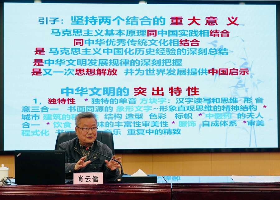 肖教授结合自己的文化实践与学术思考,以文化和思维结构的角度,从“道一,兼二,趋三,求称”四个方面系统阐释了中华文明的文化属性以及与世界文明的同步发展、双向营养等重要课题,围绕中华文化有什么、是什么、为什么以及如何认识、传承、弘扬中华传统文化等内容作了专题辅导。
